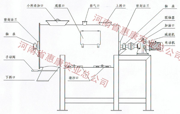設(shè)備分內(nèi)外多層螺帶,筒身為圓形,通過攪拌軸的高速旋轉(zhuǎn),使內(nèi)外螺旋帶在較大范圍內(nèi)翻動物料,內(nèi)螺旋帶推動物料向兩側(cè)對流運動,外螺旋帶推動物料由兩側(cè)向