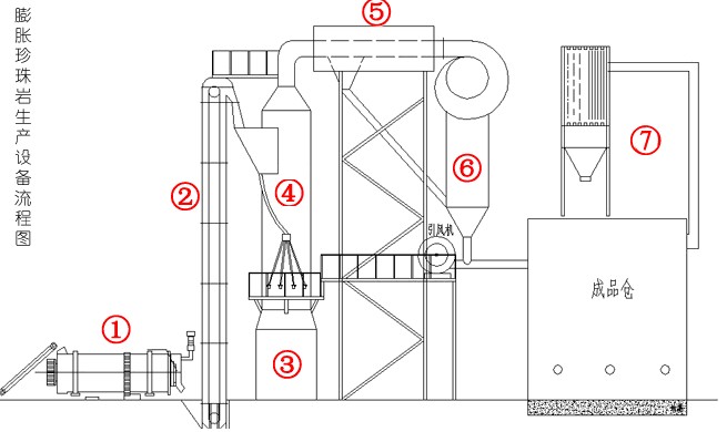 原砂—預熱爐—斗式提升機—珍珠巖膨脹爐—水冷系統(tǒng)—蝸牛式分離器—風送系統(tǒng)—稱量包裝—除塵系統(tǒng)